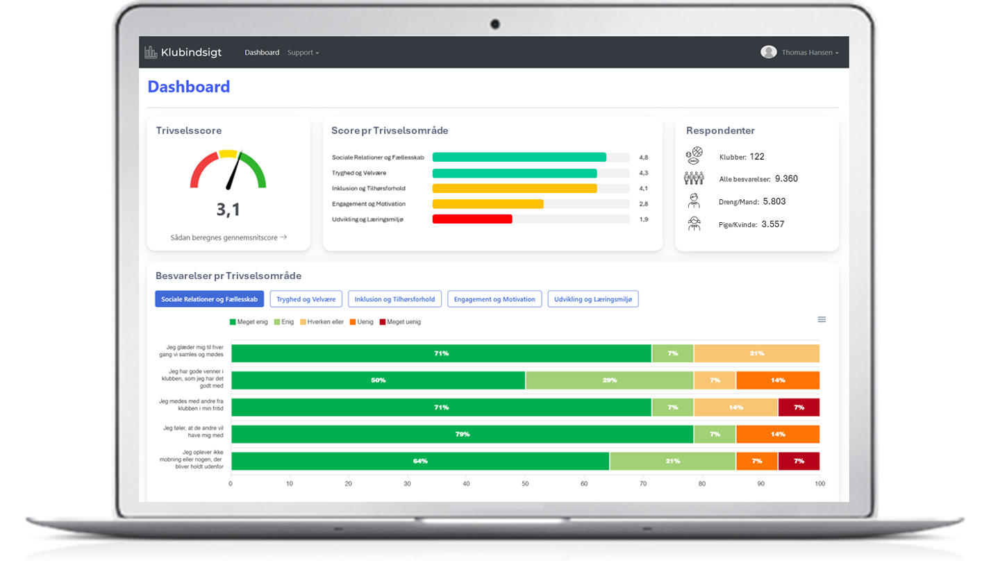 Dashboardet giver jer et klart og brugbart overblik over trivsel, deltagelse og fællesskab blandt unge. Resultaterne præsenteres visuelt og letforståeligt, så I hurtigt kan se, hvor der skal sættes ind - og hvad der allerede fungerer.
